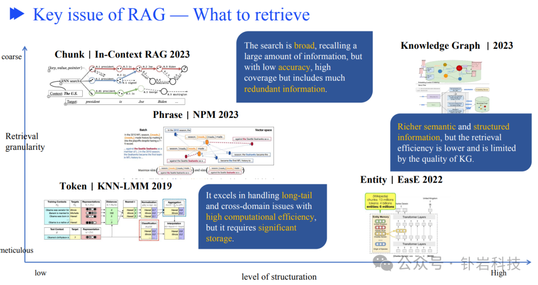 关于检索什么层级的内容,我们可以从检索粒度的粗细,以及数据结构化的高低来看业界研究结果。