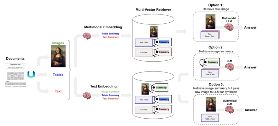 - 选项3:生成摘要、embedding,根据之找到原图,多模态 LLM 完成问答。