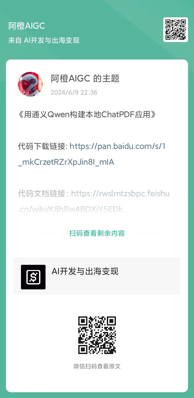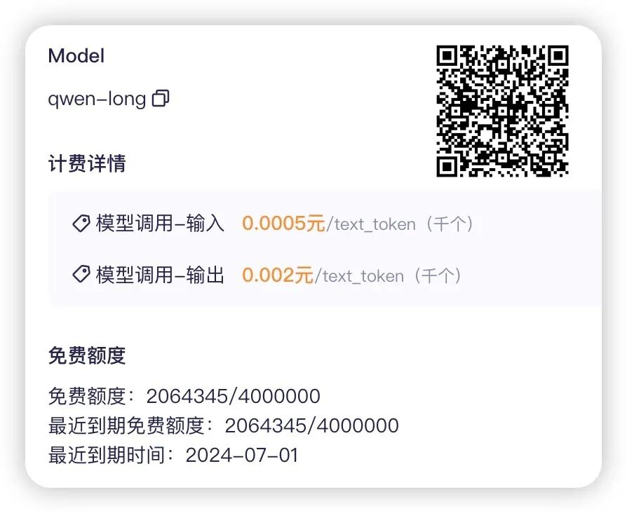 大家好!今天我要和大家分享的是如何使用通义千问 Qwen 大模型来构建一个本地的 ChatPDF AI助手。这个助手可以让你上传 PDF 文件,然后基于文件内容和它进行对话,非常方便和有趣,我们不用担心文档数据泄露,个人隐私也可以得到保护。通过部署到云服务器,我们也可以构建一个网站应用。演示如下:接下来,我会一步一步地带你了解这个项目的实现过程,希望大家能喜欢。因篇幅有限,文中仅展示部分代码,文末提供完整代码和文档下载方式。 我们需要通过阿里云百炼平台获取大模型API,因为我要构建一个文档对话应用,所以这里我选用的是Qwen-Long这个大模型,Qwen-Long是在通义千问针对超长上下文处理场景的大语言模型,支持最长1000万tokens(约1500万字或1.5万页文档)的超长上下文对话。配合同步上线的文档服务,可支持word、pdf、markdown、epub、mobi等多种文档格式的解析和对话。 正好阿里云也在搞618活动,现在扫码注册还可以领取400万tokens的免费额度和云服务器优惠券,正好用来低成本开发部署一个AI应用,错过再等一年!