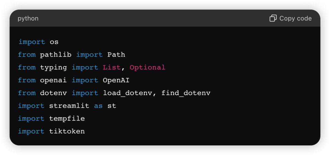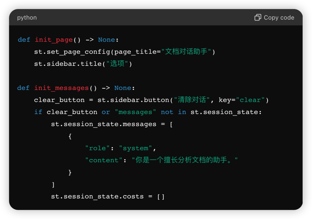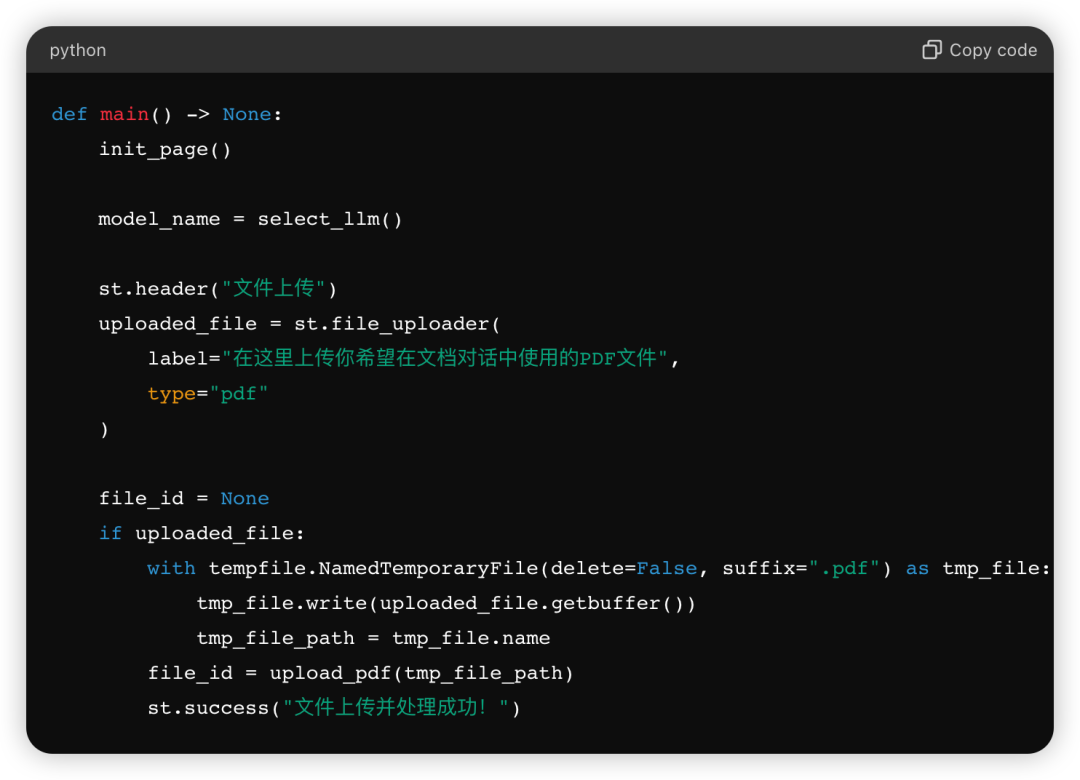 首先,我们需要导入一些必要的库和模块。我们主要会用到openai、streamlit和 tiktoken。其中,tiktoken 是用来处理 token 编码的,这样可以帮我们计算对话的费用。 接下来,我们需要加载环境变量。通过 dotenv 模块,我们可以从 .env 文件中加载配置。只要把 .env 文件放在项目的根目录中就可以了。 然后,我们需要初始化客户端。只需获取通义千问大模型的 API 密钥,并用它创建一个客户端实例。如果密钥没有设置好,程序会提醒你。 接下来,我们初始化 tiktoken 的编码器,这个小工具可以帮我们计算消息的 token 数量。然后我们来定义一些初始化页面和对话消息的函数。init_page 函数设置页面和侧边栏的标题,而 init_messages 函数用来初始化对话消息。 我们还需要一个上传 PDF 文件的函数 upload_pdf。这个函数会把文件上传到 OpenAI 的文件服务,并返回文件的 ID。然后,我们定义一个选择语言模型的函数 select_llm,从 Streamlit 的侧边栏读取用户选择的模型名称。 接下来是获取 AI 回答的函数 get_answer。这个函数接受模型名称、消息列表和文件 ID 作为参数。首先添加包含文件 ID 的系统消息,然后获取用户的实际问题,调用 OpenAI 的聊天完成接口获取回答,并返回回答内容。我们还需要一个计算对话费用的函数 calculate_cost。这个函数会计算消息列表中所有消息的 token 数量,然后根据每千个 token 的价格计算总费用。这样你就能知道自己花了多少钱。 最后,我们来看看主函数 main。这个函数会初始化页面和对话消息,处理文件上传,获取用户输入,并显示对话历史和费用。具体流程是先初始化页面,然后选择模型,上传文件,初始化对话消息,获取用户输入,调用 AI 获取回答,计算费用,并显示在页面上。 怎么样?是不是很有意思?你也可以在本地部署一个自己的ChatPDF AI 助手,轻松地和 PDF 文件内容进行对话,再也不用害怕文档数据泄漏,快来动手试试构建吧!