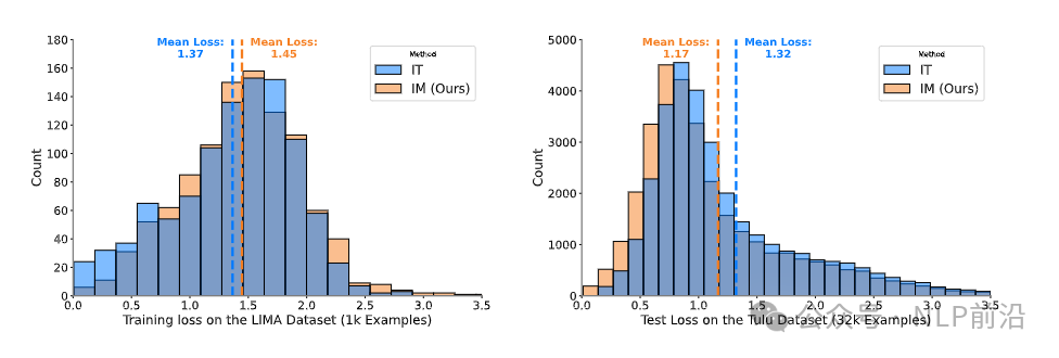 实验结果二:    - 只计算输出部分的损失。IM 具有较高的训练损失和较低的测试损失,这表明与 IT 相比,IM 有效地缓解了过度拟合问题。