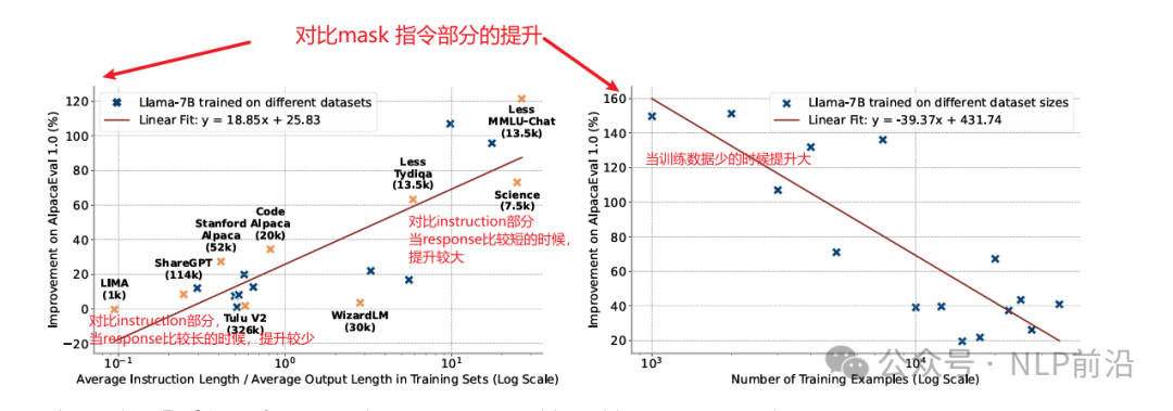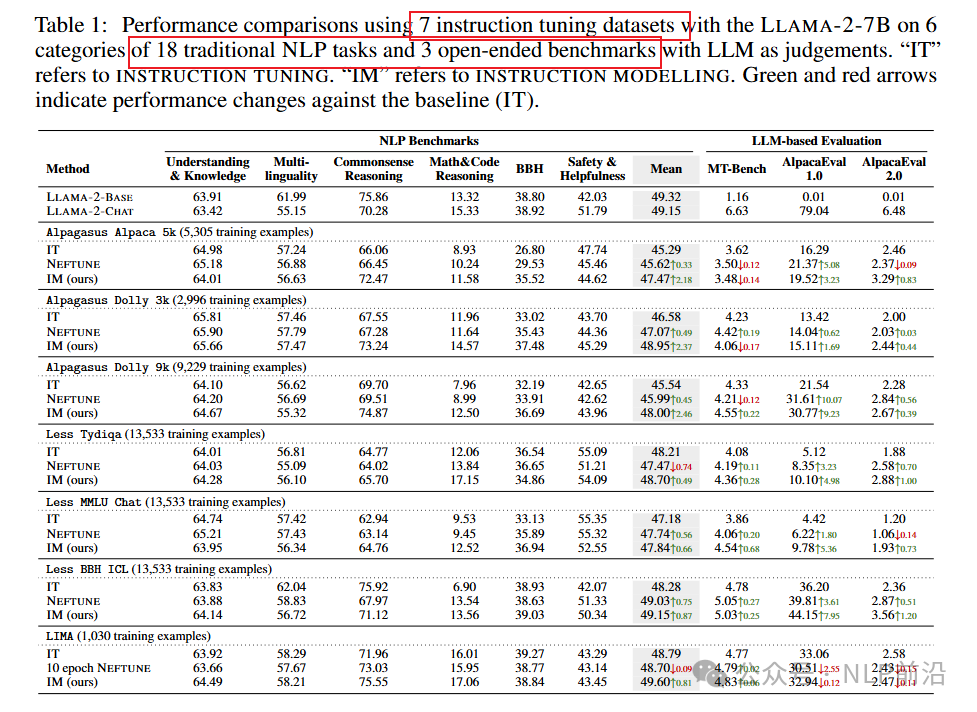 “指令微调过程中,是否需要mask掉提示词部分的损失?”这似乎是个很常见的问题,很多训练仓库里边这部分输入的label都会改成-100,计算损失的时候,忽略这部分。当然也有的仓库会计算这部分,比如trl里边比较早的一些例子。  针对这种冲突,当然有一些研究给出了一些实验结果,如下图为,qlora中的一个对比图,发现只在target上训练上可以获得更好的效果。相对来说,这些实验因为都是一些附加实验,所以不够深入,今天的分享的文章深入探讨了这个问题。  简洁版结论: 名词定义:损失同时考虑prompt+response,称为IM(instruction modelling);损失只考虑response,称为IT(instruction tunning) 通过在 21 个不同的基准测试中进行实验,作者发现 IM 方法在许多情况下都能有效地提升 LMs 在自然语言处理(NLP)任务(例如 MMLU、TruthfulQA 和 HumanEval)以及开放式生成基准测试(例如 MT-Bench 和 AlpacaEval)上的性能。特别是在 AlpacaEval 1.0 上,IM 方法在最有利的情况下能够将模型性能提升超过 100%。