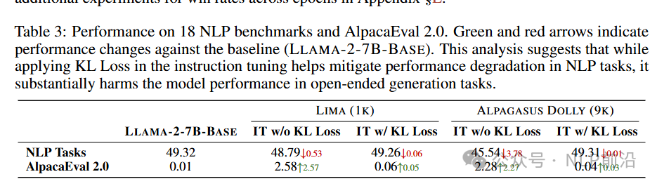 - KL正则化不能轻易解决指令调优的过拟合问题。(1)结合 KL 损失可以减少过度拟合并减少传统 NLP 任务的性能下降。(2)KL Loss 会对模型的指令跟随能力产生不利影响。