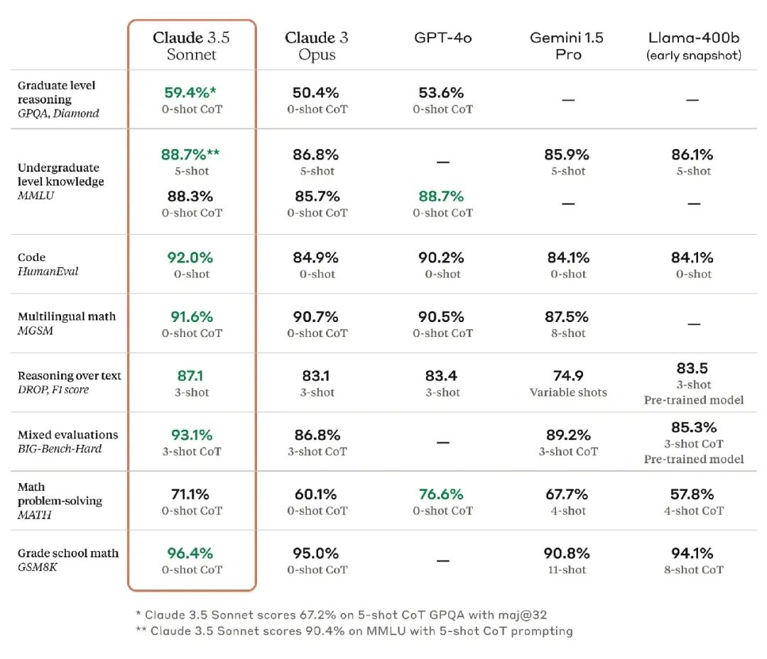 Claude 3.5 Sonnet 在研究生推理(GPQA)、本科知识(MMLU)和编码能力(HumanEval)等方面,较之其他模型遥遥领先,并且对语言中的细微差别、幽默和复杂指令方面的理解有显著提升。在撰写内容时,显得更加自然。