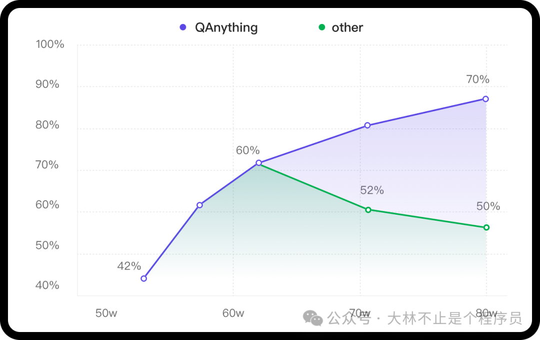 知识库数据量大的场景下两阶段优势非常明显,如果只用一阶段 embedding 检索,随着数据量增大会出现检索退化的问题,如下图中绿线所示,二阶段 rerank 重排后能实现准确率稳定增长,即数据越多,效果越好。