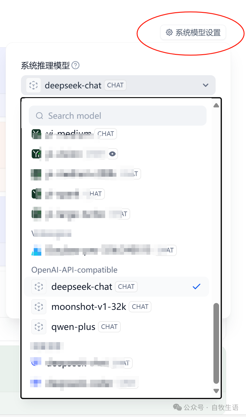 - 点击系统模型设置,从上一步设置的OpenAI-API-compatible中选择一个作为系统缺省模型: