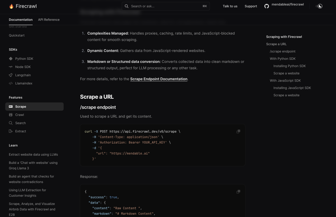 Firecrawl 是一个功能强大的爬虫工具,提供了开源和商用两个版本,开源版本的star数量也很多,自身对自己的定位强调API,强调与大模型的结合,在使用手册都专门针对 llamaindex 和 langchain也有说明,官网版本也支持下载 md,json 格式这些更容易被 LLM读懂的格式 去官网商用版本不用注册也能在线爬取网站, 使用门槛低,免费版可以网页爬取大量/复杂网页抓取,得付费版,根据响应速度,一天爬取次数和并发数量收费个人测试下来,免费版简单的静态网页爬取,搜索需要 5s左右,速度有点慢商用版本支持 search, scraping(免费版只能 scrape 一个 url,相当于 crawl) 和 crawling,和目前处于测试版本的 LLM extract这里我用了搜索功能,出现 6 个相关文章, 右上角可以下载全部回答为Json文件,再传给 ChatGPT4 进行整理点击 get code 能看到这次搜索的api 相关代码产品本身重视 api 服务, 可以作为ai 产品的工具/插件,说明文档有很多针对不同平台,语言(python,lanchain,llamaindex) api 请求访问的教程 如果直接要用官方 api,不自己部署,需按照 api 收费,每个账户都 300 credits 的免费 api 额度curl-XPOSThttps://api.firecrawl.dev/v0/scrape\ -H'Content-Type:application/json'\ -H'Authorization:BearerYOUR_API_KEY'\ -d'{ "url":"https://mendable.ai" }'