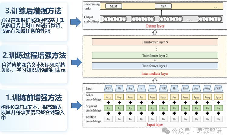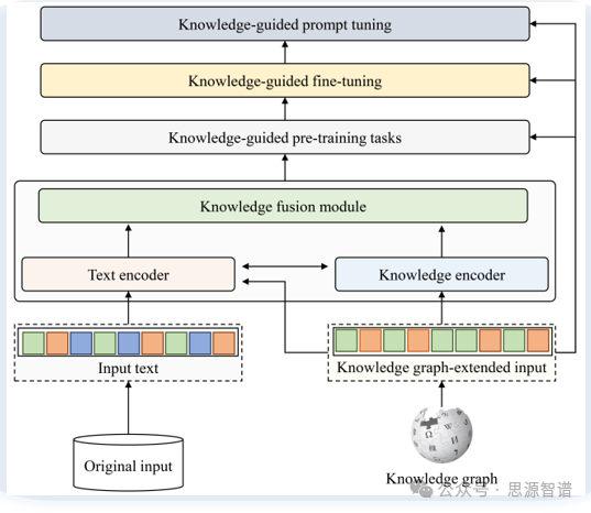 (1)训练前增强KGLLM。可用于构建KG扩展文本,提高输入质量并将事实信息整合到输入中。
