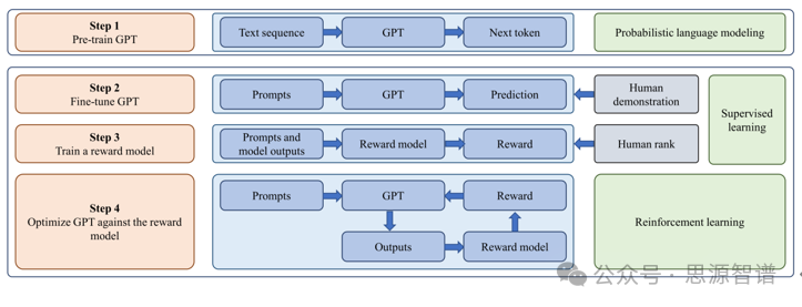 大模型LLM最引人注目的应用是ChatGPT,它采用GPT-3.5进行对话,展示了惊人的对话能力。ChatGPT的实现过程如下图: