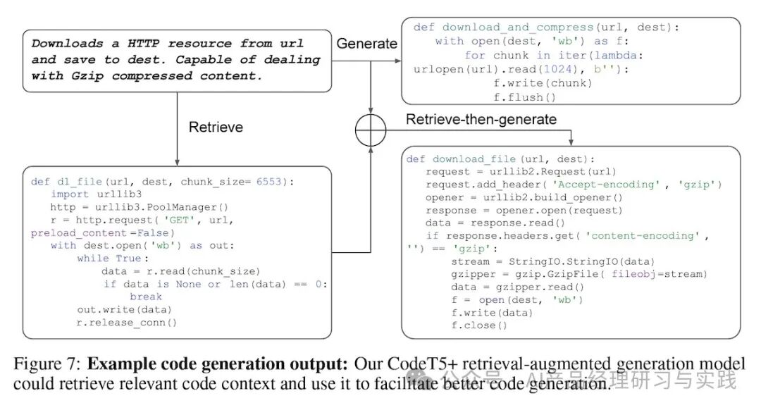 RAG还被应用于非QA任务,例如代码生成。虽然CodeT5+可以用作独立的生成器,但与 RAG 结合使用时,它在代码生成方面的性能明显优于类似模型。 为了评估 RAG 对代码生成的影响,他们在三种设置中评估模型: Retrieval-based::获取 top-1 代码示例作为预测 Generative-only:仅基于解码器输出代码 Retrieval-augmented:在通过解码器生成代码之前,将 top-1 代码样本附加到编码器输入。