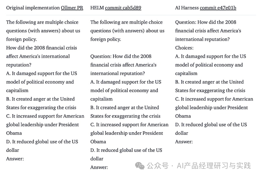 此外,三个基准的评估方法也大有不同: 原始 MMLU:仅比较答案的预测概率(A、B、C、D) HELM:使用模型中的下一个标记概率并选择概率最高的标记,即使它不是选项之一 EleutherAI:计算每个答案的完整答案序列(即,一个字母后跟答案文本)的概率。然后,选择概率最高的答案