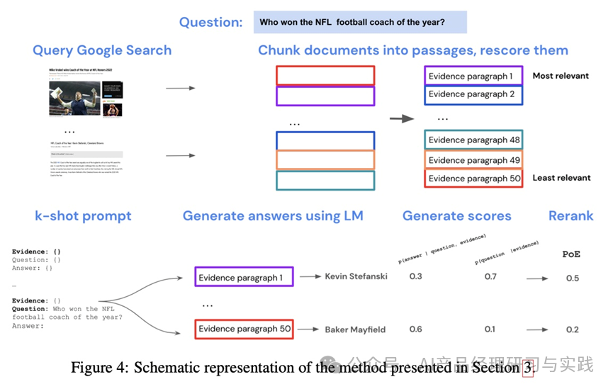 检索到的段落用于通过几次提示来调整大语言模型。他们采用来自传统闭卷QA(仅提供问答的)的k-shot prompting(k=15),并用证据段落对其进行扩展,使得每个上下文都是证据、问题和答案三元组。 对于生成器,他们使用了 Gopher,这是一个在 300B 令牌上训练的 280B 参数模型。对于每个问题,他们根据检索到的 50 个段落中的每一个生成四个候选答案。最后,他们通过直接推理、RAG、噪声通道推理和专家乘积 (PoE) 等多种方法估计答案概率来选择最佳答案。PoE 始终表现最佳。