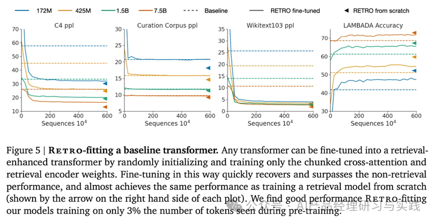 在检索过程中,RETRO 将输入序列拆分为大小为64Tokens的块。然后,它找到与前一个块相似的文本,为当前块提供上下文。检索索引由两个连续的标记块组成,N和F。前者是用于计算密钥的邻居块,而后者是原始文档中的延续块。 检索基于 BERT 嵌入上通过距离(欧几里得)的近似最近邻。(有趣的是,与通常的余弦或点积相似度不同。)基于 SCaNN 构建的检索索引可以在 10 毫秒内查询 2T 令牌数据库。 他们还演示了如何复古拟合现有的基线模型。通过冻结预训练的权重并仅训练分块的交叉注意和邻居编码器参数(< 7B 模型权重的 10%),它们可以通过检索增强 Transformer,同时只需要 6M 训练序列(预训练的 3%)序列)。配备 RETRO 的模型能够超越基线模型的性能,并达到接近从头开始训练的 RETRO 的性能。 下图示意了对基线Transformer模型进行RETRO改造。任何Transformer模型都可以通过随机初始化并仅训练分块交叉注意力和检索编码器权重来进行微调,使其成为一个检索增强型Transformer。以这种方式进行微调可以迅速恢复并超越非检索性能,并几乎达到从零开始训练检索模型的同等性能(如每个图的右侧箭头所示)。我们发现,仅使用预训练期间看到的3%的Token数量进行RETRO改造,我们的模型就展现出了良好的性能。