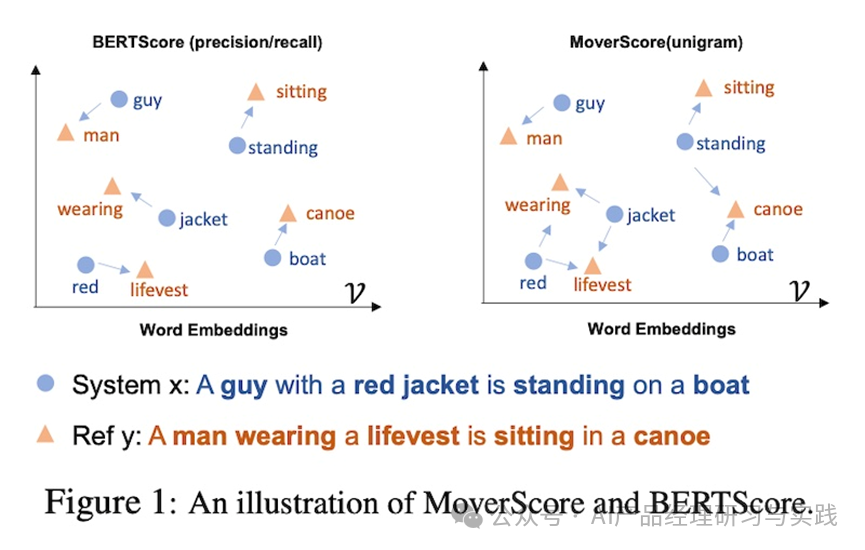 ↑ BERTScore(左)VSMoverScore(右)的示意图 MoverScore 能够将一个序列中语义相关的单词映射到另一序列中的对应单词。它通过解决一个约束优化问题来实现这一点,该问题找到将一个文本转换为另一个文本的最小努力,测量将一个序列转换为另一个序列所需移动的距离。