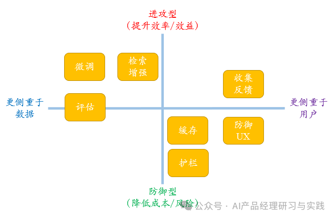 有7种关键的模式可以将大型语言模型 (LLM) 集成到系统和产品中,分别是: 评估(Evals):用于衡量表现,例如自动化的内容审核系统,可以使用评估来确保生成的文本符合特定的质量和标准。 检索增强生成(RAG):可添加新近的/外部的知识,例如利用RAG从知识库中检索相关信息以更准确地回答客户问题的智能客服系统。 微调(Fine-tuning):更好地完成特定任务,例如在线购物平台的虚拟服装试穿功能。通过微调,系统可以学习用户的身体特征(如身高、体重、体型)、风格偏好(如休闲、正式、运动)和购买历史,从而推荐合适的服装搭配给用户。 缓存(Caching):减少延迟、降低成本,例如基于LLM的文档摘要工具,使用缓存机制来存储和重用先前生成的摘要。当用户请求相似的文档摘要时,系统可以快速返回缓存的结果,提高响应速度。 安全护栏(Guardrails):用于确保输出质量,例如金融咨询聊天机器人,使用护栏来确保提供的财务建议是准确和合规的。系统会对生成的建议进行结构性和语义性检查,确保不违反任何金融法规或公司政策。 防御性用户体验(Defensive UX):优雅地预测和管理错误。例如智能家居系统,用户可以通过语音命令控制家中的各种设备,但为了防止误操作,系统设计了防御性UX。例如,当用户说“关闭所有灯光”时,系统会要求用户确认这个操作,以防止用户在不知情的情况下关闭所有灯光。 收集用户反馈(Collect user feedback):用于构建数据飞轮,例如个性化的语言学习应用,可以使用用户反馈来改进其语言练习和纠正功能。用户提供关于练习难度、纠正准确性和整体体验的反馈,帮助应用不断优化其LLM驱动的语言学习工具。 这7种模式按照从数据到用户、从防御到进攻的不同侧重点来看,可以按下图理解: