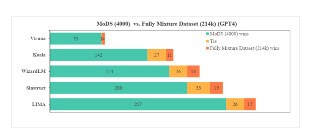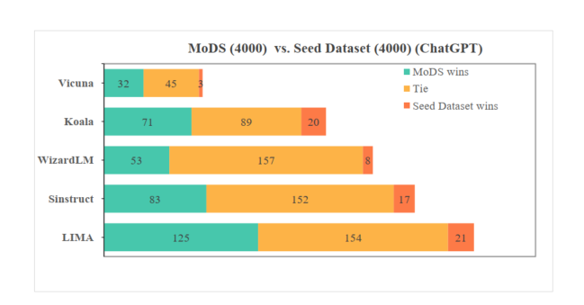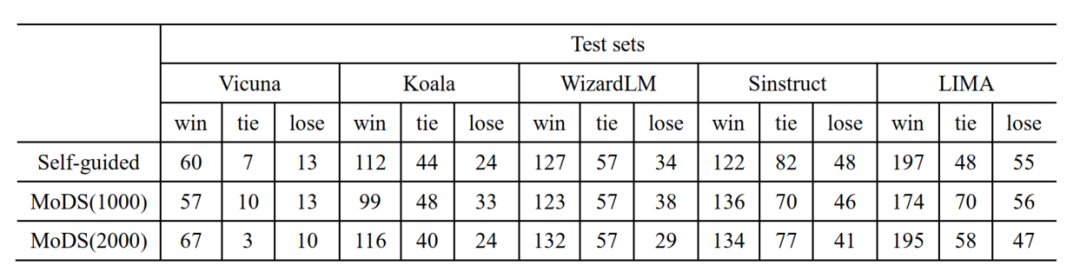 模型训练最终利用种子指令数据集和增强指令数据集一起对模型进行指令微调,获得最终模型。 实验结果训练数据训练数据有两种,一种是单独的Alpaca数据集(52k),一种时混合数据集(214k),包含HC3数据集、Alpaca数据集、Alpaca-evol-instruct数据集、Dolly-v2数据集、InstructWild数据集和LIMA数据集。 测试数据主要包含5个测试集,分别为Koala数据集(180)、WizardLM数据集(218)、Self-instruct数据集(252)、Vicuna数据集(80)和LIMA数据集(300)。 训练超参模型基座采用LLaMA2-7B模型,训练过程中学习率为2e-5,warmup的比率为0.03,权重衰减为0.0,批大小为128,训练轮数为3。在质量评价和必要性评价过程中,Alpaca数据集的α和β均设置为0.0,混合数据集的α和β分别设置为1.0和-1.0。 在模型测试过程中,采用ChatGPT和GPT4作为裁判,对模型生成结果从相关性和准确性两个角度进行打分,每个角度的评分从1到10。在评价两个模型胜、平、负时,当两个角度评分都高时为胜;当两个角度评分一高一低时为平;当两个角度评分都低时为负。 结果分析在Alpaca数据集中通过MoDS方法获取1k数据的效果要优于全量数据训练的结果,如下图所示。 在Alpaca数据集中MoDS方法在选择2k数据时,训练效果优于基于IFD的自动选择方法,如下表所示。 在混合数据及中MoDS方法获取4k数据的效果全面优于全量数据训练的结果,如下图所示。 验证指令多样性选择的重要性,与随机选择进行对比,如下图所示。 验证必要性筛选的重要性,与仅用种子数据训练的模型进行对比,如下图所示。 |