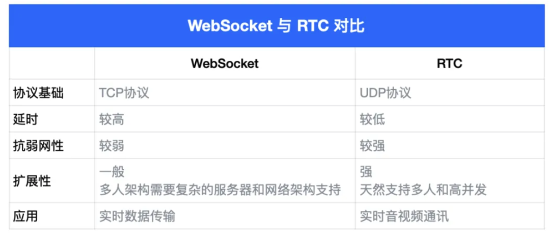 拓展限制:WebSocket 对于视频或多人交互场景显得“力不从心”。视频比音频使用更多的网络带宽,丢失和延迟的数据包也会更频繁;随着交互个体的增多,音视频流的发布和订阅管理也变得更加复杂。