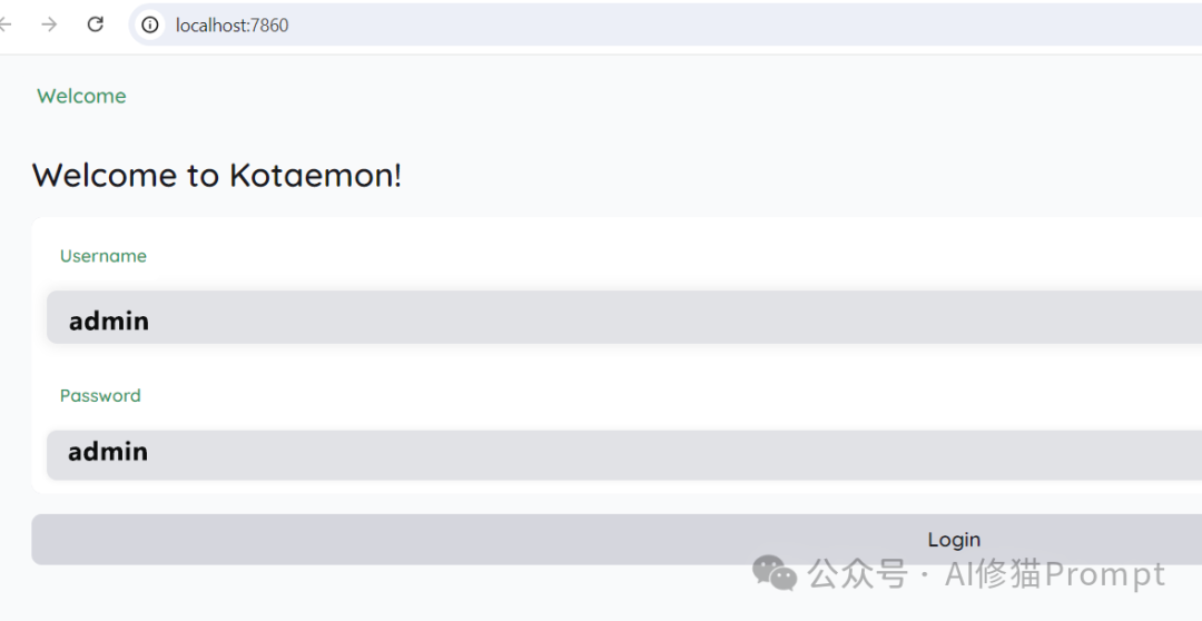 第一次启动本地7860端口可能需要点时间,页面报错你稍等一下。当你启动以后,你应该可以看到如下界面,直接填如两个admin即可。