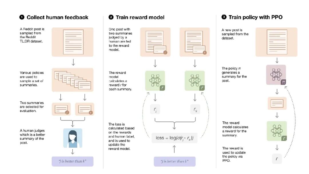 2.1 大模型的自我监督预训练从收集一个庞大而多样化的数据集开始,通常包括广泛的主题、语言和写作风格。这个数据集作为语言模型的初始训练场。 利用这个数据集,模型进行自我监督学习。在这里,模型被训练来预测给定其他部分的文本部分。例如,它可以根据前面的单词预测句子中的下一个单词。这个阶段帮助模型掌握语言的基础知识,包括词法、语法和一定程度的上下文理解。成果是一个基础模型,可以生成文本并理解某些上下文,但缺乏针对特定任务的专门化微调。 2.2 基于人工反馈对模型输出排名一旦预训练完成,模型开始生成文本输出,然后由人进行评估。这可能包括完成句子、回答问题或进行对话等任务。人类评估者使用评分系统对每个输出进行评分。他们考虑的因素包括文本的相关性、连贯性或吸引力。这种反馈至关重要,因为它将模型引入到人类的偏好和标准中。 注意确保评价人员的多样性并减少反馈中的偏见。这有助于为模型的输出创建一个平衡和公平的评估标准。 2.3 训练奖励模型来模仿人类评分人类评估者的得分和反馈被用来训练一个单独的模型,称为奖励模型。该模型旨在理解和预测人类评估者对语言模型生成的任何文本的评分。这个步骤可能涉及反馈收集和奖励模型调整的几个迭代,以准确捕获人的偏好。 2.4 使用来自奖励模型的反馈来微调语言模型从奖励模型中获得的见解被用来微调语言模型。这包括调整模型的参数,以增加生成与奖励行为一致的文本的可能性。 采用近似政策优化(PPO)等技术有条不紊地调整模型。该模型被鼓励去“探索”生成文本的不同方式,但是当它生成的输出可能从奖励模型中获得更高的分数时,它会得到更多的“奖励”。这个微调过程是迭代的,可以通过新的人工反馈和奖励模型调整来重复,不断改进语言模型与人类偏好的一致性。