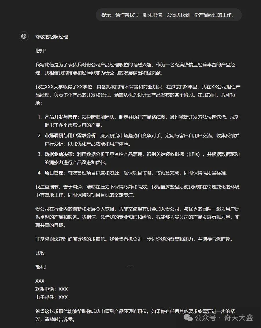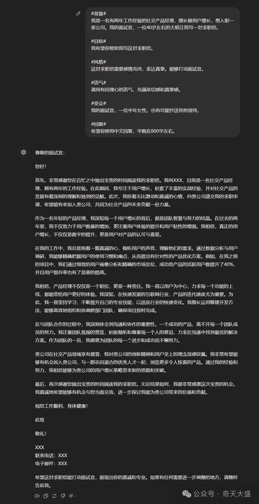 为了更好地让大家理解CO-STAR框架的实际应用,以下将我将通过一个实例进行说明。假设你是一名社交产品经理,需要找一份工作。你看中了一家公司,这家公司的面试官是一名40岁左右的女士,她要求你写一封求职信。