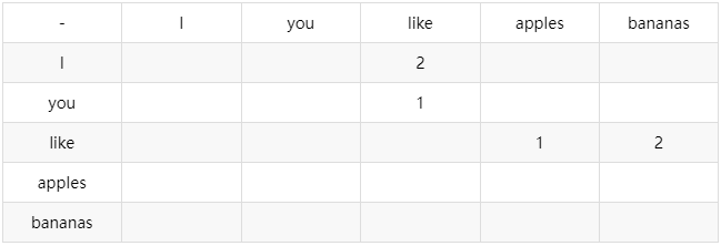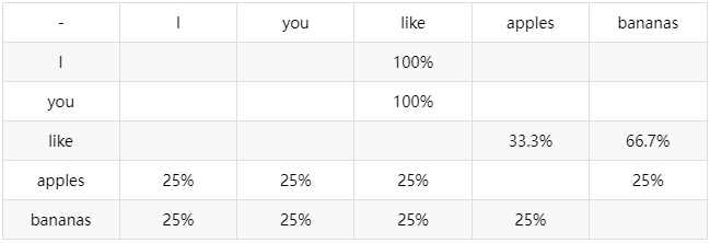 generate_text() 函数将用户提示作为参数。这可能是一个问题。 tokenize() 辅助函数使用 tiktoken 或类似库将提示转换为等效的 Token 列表。 在 for 循环中,get_token_predictions() 函数是调用 AI 模型以获取下一个 Token 的概率,如前面的例子所示。 select_next_token() 函数的作用是获取下一个 Token 的概率(或预测)并选择最佳 Token 以继续输入序列。 函数可以只选择概率最高的 Token,这在机器学习中称为 “贪心选择(greedy selection)”。 更好的是,它可以使用随机数生成器来选择一个符合模型返回概率的 Token,从而为生成的文本添加一些变化。这也会使模型在多次给出相同提示时产生不同的响应。 为了使 Token 选择过程更加灵活,LLM 返回的概率可以使用超参数进行修改,这些超参数作为参数传递给文本生成函数。超参数允许你控制 Token 选择过程的 “贪婪” 程度。 如果你使用过 LLM,你可能熟悉 temperature 超参数。temperature 越高,Token 概率越平坦,这增加了选择不太可能的 Token 的机会,最终使生成的文本看起来更有创造性或更不寻常。 你可能还使用了另外两个超参数,称为 top_p 和 top_k,它们控制被考虑选择的最高概率的 Token 数量。 一旦选定了一个 Token,循环就会迭代,模型会接收到一个包含新 Token 在末尾的输入,并生成另一个紧随其后的 Token。 num_tokens 参数控制循环运行的迭代次数,换句话说,就是要控制生成多少文本。 生成的文本可能(而且经常)在句子中间断开,因为 LLM 没有句子或段落的概念,它只处理一个 Token。 为了防止生成的文本在句子中间断开,我们可以将 num_tokens 参数视为最大值而不是确切的 Token 数,在这种情况下,我们可以在生成句号 Token 时停止循环。 如果你已经理解了这些内容,那么恭喜你,你现在已经大致了解了 LLM 是如何工作的。 在下一部分,我会更深入一些,但仍然尽量避免涉及支撑这一技术的数学原理,因为它相当复杂。 在不使用数学表达式的情况下讨论如何训练模型实际上是很困难的。我将从一个非常简单的训练方法开始展示。 鉴于任务是预测 Token 的后续 Token,一种简单的训练模型的方法是获取训练数据集中所有连续 Token,并用它们构建一个概率表。 让我们用一个简短的词汇表和数据集来做这个。 ['I','you','like','apples','bananas']