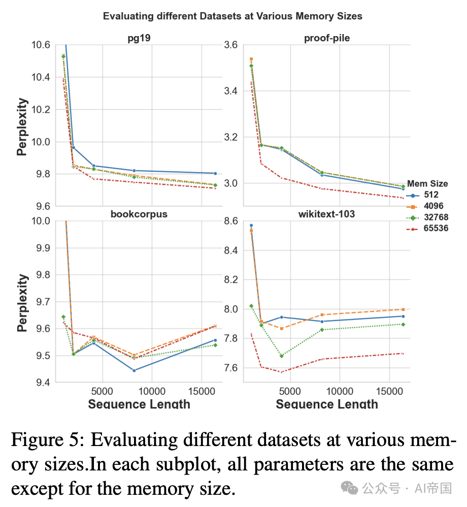 数据集。论文在四个广泛的文本基准数据集上对论文的模型进行了评估:英语书籍PG-19和BookCorpus,维基百科文章Wikitext-103,以及数学论文Proof-Pile。实验结果表明,所有数据集上的困惑度都有显著改善。论文的模型在从1024到32768个token的不同长度范围内进行了测试。通过利用外部检索器和内存,论文的模型在所有数据集上展示了显著的性能提升,且内存开销最小。