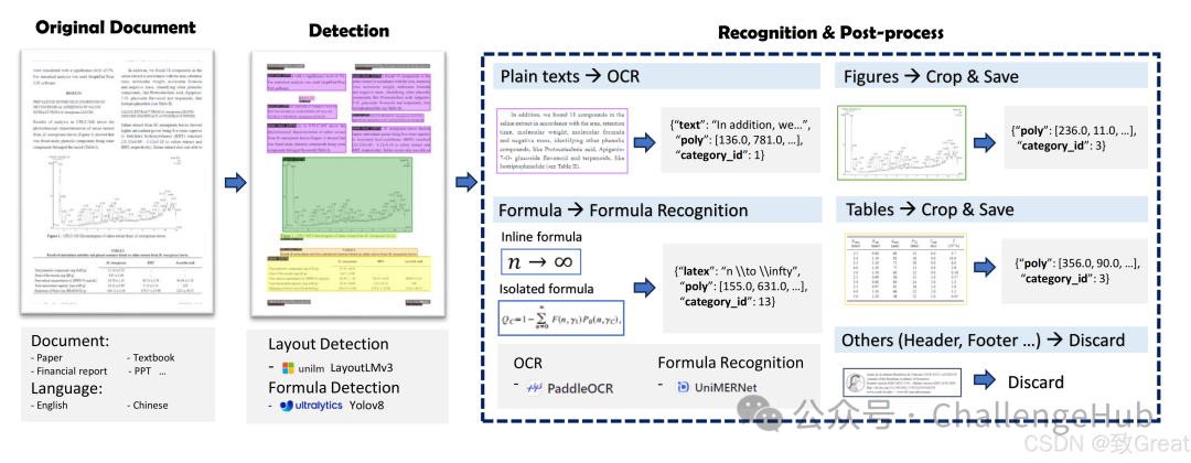 布局检测:使用LayoutLMv3模型进行区域检测,如图像,表格,标题,文本等;公式检测:使用YOLOv8进行公式检测,包含行内公式和行间公式;公式识别:使用UniMERNet进行公式识别;表格识别:使用StructEqTable进行表格识别;光学字符识别:使用PaddleOCR进行文本识别;