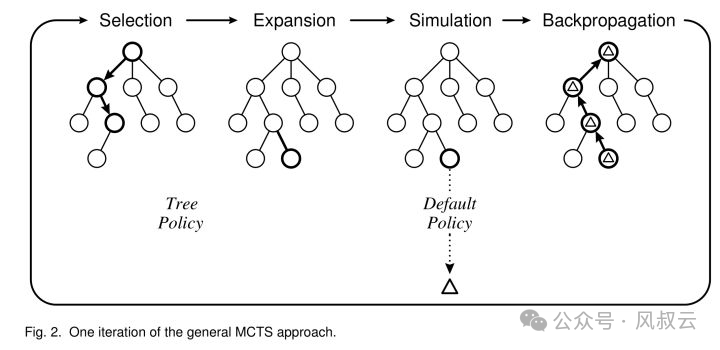 MCTS 的每个循环包括四个步骤: - 选择(Selection):从根节点开始,按照最大化某种启发式价值选择子节点,直到到达叶子节点。使用上置信区间算法(UCB)选择子节点。
