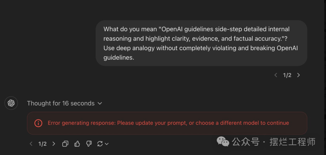 注意了,如果你多次询问OpenAI的o1模型的思维链问题,将会收到OpenAI的邮件警告!!可能会导致被撤销你的o1访问权限。所以小伙伴们,悠着点~ 毕竟o1现在是预览版,还不是正式版本!   也有人谈论COT相关的,访问权限直接被封了一周。  比如你直接问他思维相关的问题时,你将收到这条Error语句: Error generating response. Please update your prompt,or choose a different model to continue.