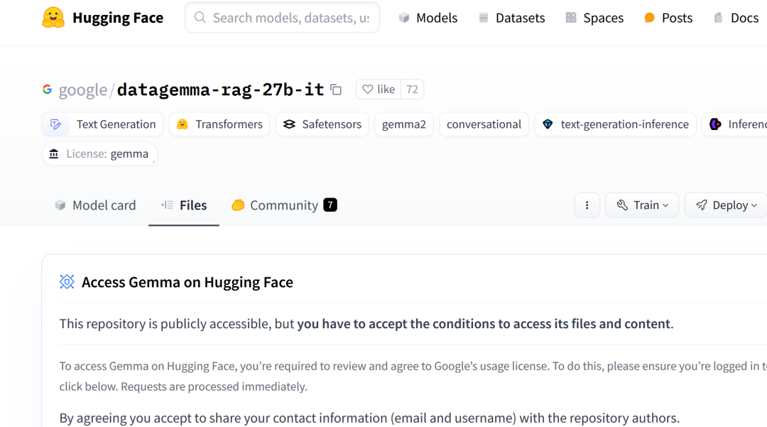 当我们提到幻觉时,意思是说,当你使用 RAG(即检索增强生成)技术时,向大型语言模型提供自己数据的上下文,有时模型在无法找到答案时,会虚构一个答案,提供误导性或错误的信息,甚至直接撒谎。 这就是所谓的“幻觉”,而这是一个巨大的问题。我在很多封闭源和开源模型中都看到过这个问题,尤其是在测试成百上千个模型时。 Data Gemma 试图解决这个问题。RAG 使语言模型能够结合其训练数据以外的相关信息,吸收更多上下文,产生更全面、信息更丰富的输出。而 Data Gemma 通过 Gemini 1.5 Pro 的长上下文窗口,能够在生成响应前从 Data Commons 检索相关的上下文信息。这是关键,它减少了幻觉的风险,并提高了响应的准确性。 Data Commons 是一个包含超过 2400 亿个数据点的公共知识图谱,涵盖成千上万的统计变量。它的数据来源于联合国、世界卫生组织、疾病控制中心、人口普查局等值得信赖的组织。 这为政策制定者、研究人员和寻求准确见解的机构提供了帮助。你可以将 Data Commons 看作一个庞大且不断扩展的数据库,充满了可靠的公共数据,Data Gemma 就是基于这些数据进行训练的。 模型card中提供了许多关于训练的详细信息,我会在文末提供链接以供参考。现在,需要确保你已登录 Hugging Face,这是一个免费的平台。登录后,向下滚动页面,接受该模型的条款和条件,因为这是一个 GED 模型,所以必须接受这些条款。 现在我们创建一个 Conda 虚拟环境,我强烈建议你这么做。如果你不熟悉 Conda,可以在我的频道找到相关文章。现在我们来创建这个 Conda 环境,名为 DG(Data Gemma),这个过程非常快。