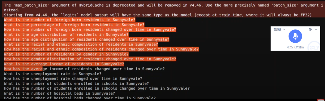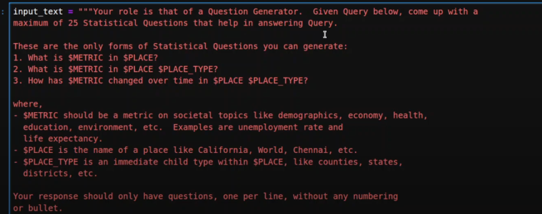 现在让我们看看如何使用这个模型进行推理。 我们给模型输入一个文本,要求它生成最多 25 个与查询相关的统计问题。模型将生成这些问题,我们将其转化为可理解的查询,并进行解码和打印。