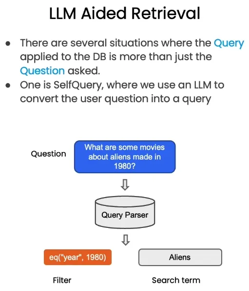 例如,用户可能会询问 "1980年有哪些关于外星人的电影?",这个问题不仅包含了具体的主题 "外星人",还包含了时间限制 "1980年"。通过 LLM 的辅助,我们可以将这个查询解析为两个部分:过滤条件(filter)和检索主题(search term)。这样,过滤条件可以用于筛选数据集中的特定年份,而检索主题则用于匹配相关内容,提升整体检索的精准度和有效性。