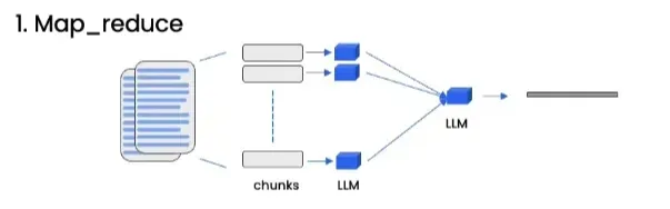 Map_reduce 方法将文档分成多个小块(chunks),每个块单独传递给语言模型(LLM)生成独立答案。然后,所有生成的答案会被合并成最终答案,合并过程(reduce)可能包括总结、投票等操作。