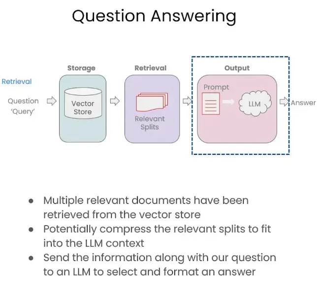 • 检索相关信息 向量存储会根据问题的向量表示,返回多个最相关的文档片段(Relevant Splits)。这些文档片段通常包含了问题的答案或解答所需的关键背景信息。这也是我们前几节课探讨的重点内容。