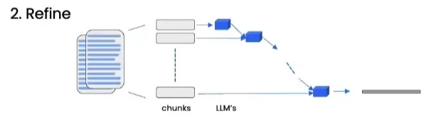 Refine 方法从第一个文档块中生成一个初始答案,然后对后续文档块逐一处理。每个块会对已有的答案进行补充或修正,直到所有块处理完成,最终得到经过优化和完善的答案。