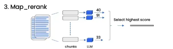 Map_rerank 方法将文档分成多个块,每个块都单独生成答案,并给这些答案打分。打分依据可以是相关性、质量等指标,最后选择得分最高的答案作为最终输出。这就像一个比赛。每个文档块都生成一个答案,这些答案好比参赛者。然后,每个答案会被打分,分数越高代表越接近问题的需求。最后,选择分数最高的那个答案作为最终结果。