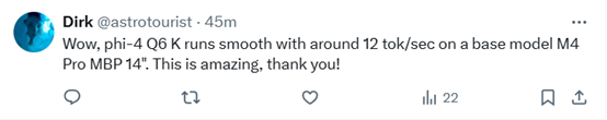 哇,phi-4 模型能在苹果的M4 Pro笔记本上,以每秒约 12 个tokens的速度流畅运行,这太棒了,感谢!