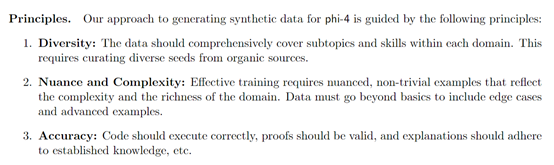 phi-4的合成数据生成遵循多样性、细腻性与复杂性、准确性和推理链等原则。涵盖了 50 多种不同类型的合成数据集,通过多阶段提示流程、种子策划、改写与增强、自我修订等多种方法,生成了约 4000 亿个未加权的 tokens。