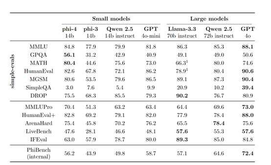 去年12月12日,微软首次展示了phi-4,参数只有140亿性能却极强,在GPQA研究生水平、MATH数学基准测试中,超过了OpenAI的GPT-4o,也超过了同类顶级开源模型Qwen 2.5 -14B和Llama-3.3-70B。