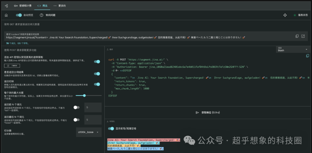 代码 本文对应完整代码已开源,地址在:https://github.com/Steven-Luo/MasteringRAG/blob/main/split/03_jina_segment_api.ipynb 由于是调用Jina API,切分的核心代码非常简单,使用POST请求将全文放到content中即可,其他参数可以直接从官方网站拷贝。