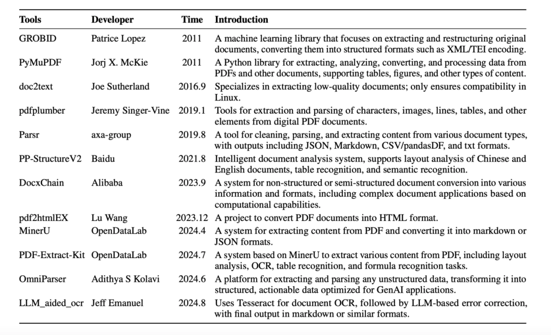 图 15:在 GitHub 上获得超过 1000 个星标的开源文档解析工具。来源:Document Parsing Unveiled[1]