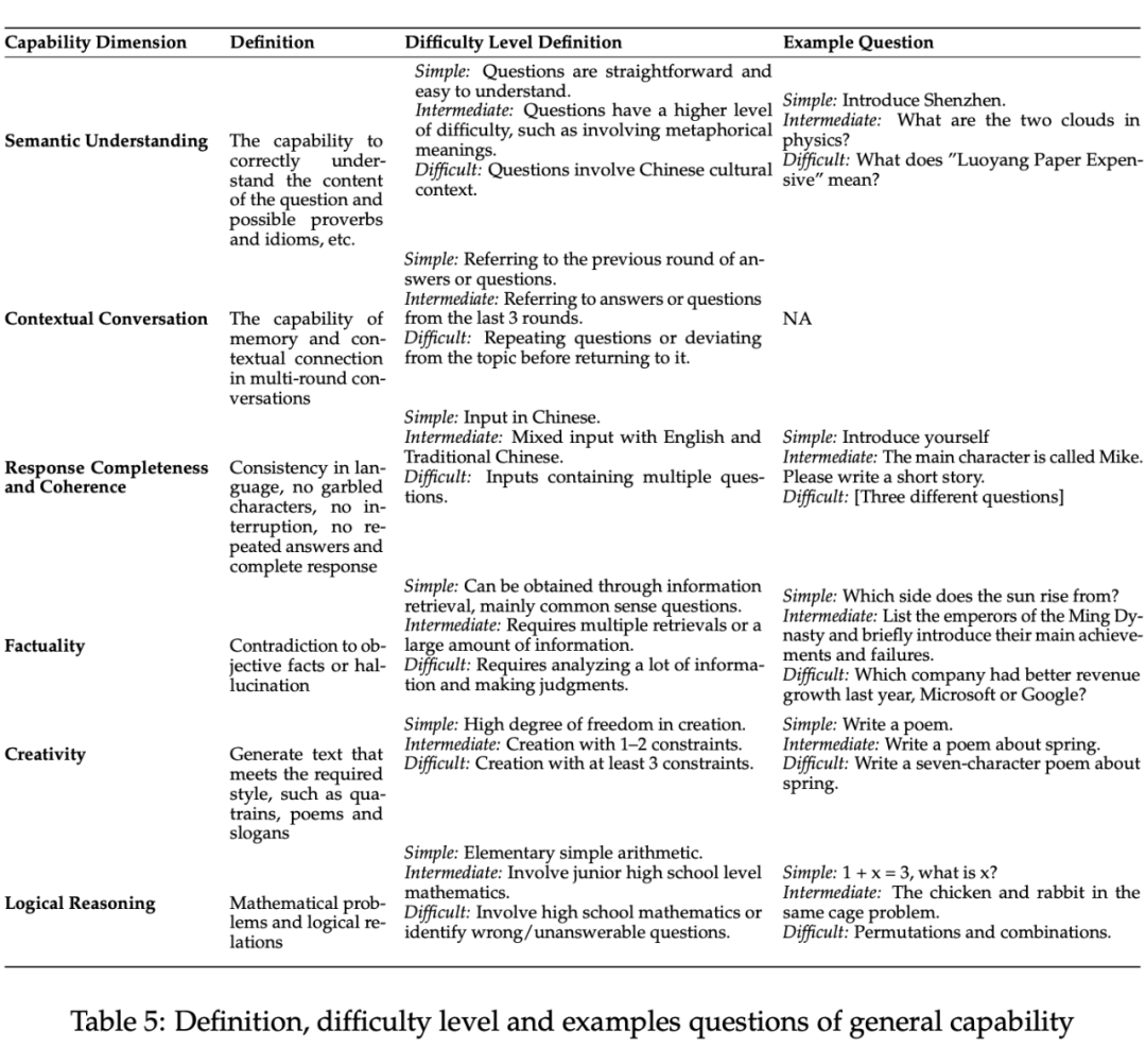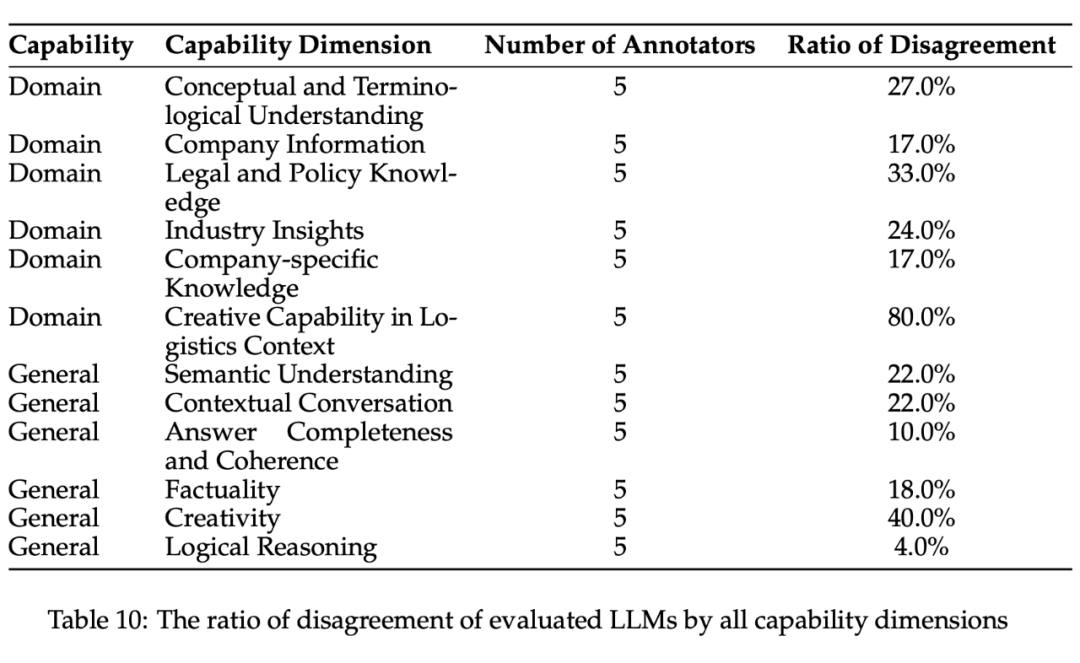 2. 归一化后的平均分数(Table 4): 3. 按比例将分数归一化到 [0, 100](Table 9): 4. 各个能力维度的分歧度(Table 10):分歧度越高,说明评测员的打分越难形成一致的共识。创造力相关的能力分歧度最高,说明每个人对于创造力的理解不一致。