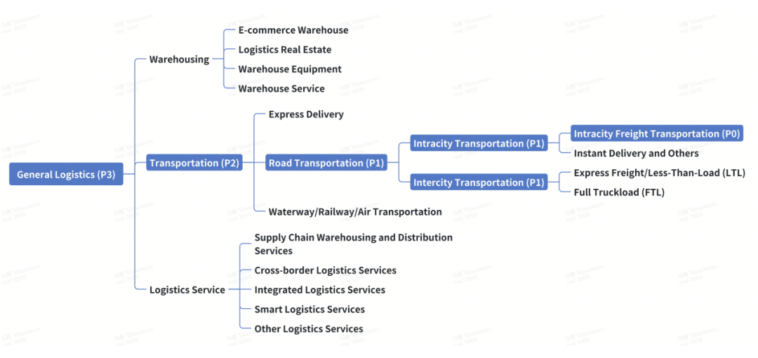 遵循 MECE 原则(Mutually Exclusive, Collectively Exhaustive 相互独立,完全穷尽), 从最底层的子领域(例如,Intracity Freight Transportation,同城货运)逐步上升到包含更广泛的子域。