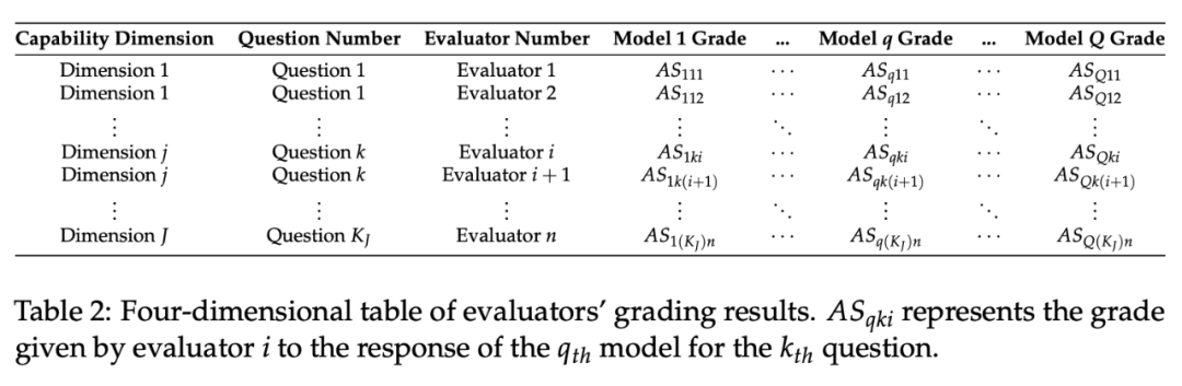 1. 汇总的得分表格如下,AS_jki 为在 j 能力维度下,评测员 i 对于问题 k 的打分,取值范围 [0, 3]。