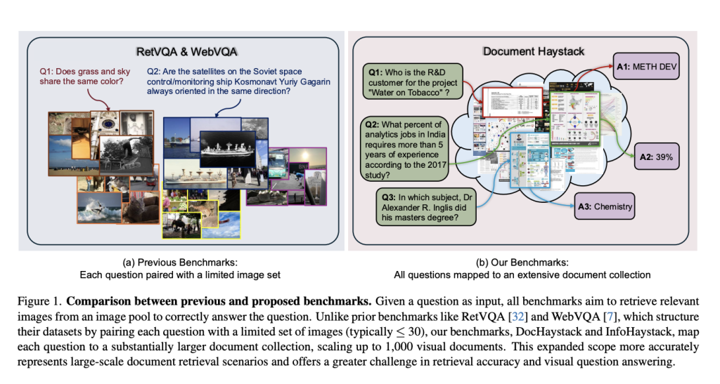 为解决大型多模态模型(LMM)在图像检索和推理方面的局限性,研究人员提出了DocHaystack和InfoHaystack两个基准测试,并开发了视觉中心检索增强生成框架(V-RAG),该框架结合了多视觉编码器和相关性评估模块,在DocHaystack-1000和InfoHaystack-1000基准测试中Recall@1分别提升了9%和11%。 LMMs 在视觉语言理解方面取得了显著进展,但在大型图像集上的推理仍然需要帮助,这限制了它们在现实世界中的应用,例如视觉搜索和查询大型数据集(例如个人照片库)。现有的多图像问答基准测试受到限制,通常每个问题最多包含 30 张图像,这需要解决大规模检索任务的复杂性。为了克服这些限制,引入了 DocHaystack 和 InfoHaystack 等新基准测试,要求模型在最多 1,000 个文档的集合中进行检索和推理。这种转变带来了新的挑战,显著扩展了视觉问答和检索任务的范围。 RAG (Retrieval-augmented generation) 框架通过将检索系统与生成模型集成来增强 LMMs,使它们能够有效地处理大量的图像文本数据集。虽然 RAG 方法已在基于文本的任务中得到广泛探索,但它们在视觉语言环境中的应用随着 MuRAG、RetVQA 和 MIRAGE 等模型的出现而获得了发展势头。这些框架利用先进的检索方法,例如 relevance encoders 和基于 CLIP 的训练,来过滤和处理大型图像集合。基于这些进步,提出的 V-RAG 框架利用多个 vision encoders 并引入了一个 question-document relevance module,在 DocHaystack 和 InfoHaystack 基准测试中提供了卓越的性能。这为大规模视觉检索和推理设定了新的标准,解决了现有 LMM 功能中的关键差距。 来自 KAUST、悉尼大学和 IHPC, A*STAR 的研究人员引入了两个基准测试,DocHaystack 和 InfoHaystack,用于评估 LMMs 在大规模视觉文档检索和推理任务上的表现。这些基准测试通过要求模型为每个查询处理多达 1,000 个文档来模拟真实场景,解决了较小数据集的局限性。他们还提出了 V-RAG,一个以视觉为中心的 retrieval-augmented generation 框架,它结合了专门的 vision encoders 和 relevance assessment module。V-RAG 在 DocHaystack-1000 和 InfoHaystack-1000 基准测试中 Recall@1 分别提高了 9% 和 11%,显著提高了 LMMs 的检索和推理能力。 为了改进文档检索和推理,DocHaystack 和 InfoHaystack 基准测试确保每个问题产生唯一的、特定于文档的答案。这些基准测试使用三步 curation pipeline 来解决歧义:使用 LLM 过滤一般性问题,手动审查特异性,以及删除可以通过常识回答的问题。Vision-centric Retrieval-Augmented Generation (V-RAG) 框架使用 vision encoder ensemble 和基于 LLM 的 filtering module 增强了从大型数据集的检索。相关的文档被排序和精炼,以专注于特定的子集。然后,问题和选定的文档由 LLM 处理以获得准确的答案,强调基于视觉的理解。 实验部分详细介绍了用于评估 V-RAG 框架的训练设置、指标、baselines 和结果。指标包括文档检索的 Recall@1、@3 和 @5,以及基于 GPT-4o-mini 模型的 VQA 任务评估。V-RAG 在 DocHaystack 和 InfoHaystack 基准测试中优于 BM25、CLIP 和 OpenCLIP 等 baselines,实现了卓越的 recall 和 accuracy scores。使用 curated distractor images 进行微调可增强 VQA 的鲁棒性。Ablation studies 表明了结合多个 encoders 和 VLM-filter module 的重要性,显著提高了检索精度。V-RAG 在具有挑战性的基准测试中的顶级性能突出了其在大规模多模态文档理解和检索任务中的有效性。