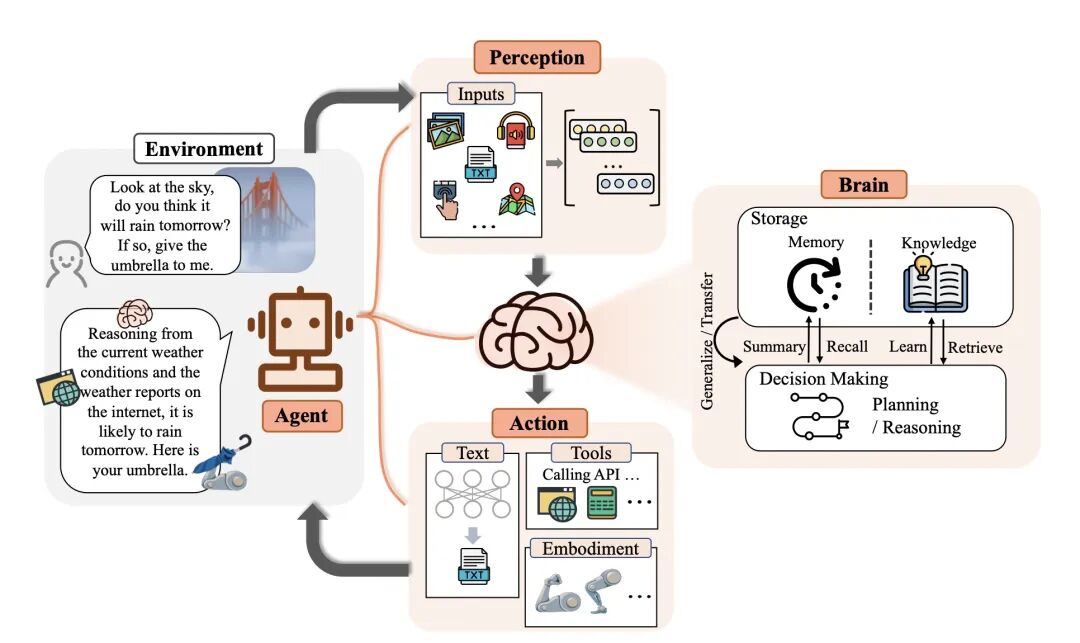感知(Perception): 从外部环境接收处理多模态信息。 规划(Planning):主要包括子目标分解、反思与改进。 记忆(Memory):包括短期记忆和长期记忆。 动作(Action):使用文字或者工具(调用外部API来获取模型权重中缺少的额外信息,包括当前信息,代码执行能力,访问专有信息源等。)来完成执行的操作,从而对外部的环境造成影响。