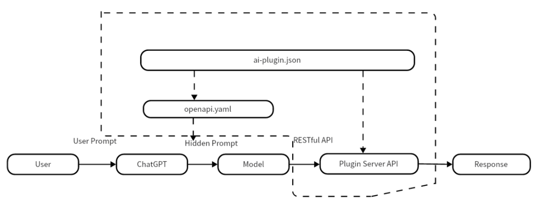 插件是大模型能力的拓展,通常通过调用外部API的方式来进行大模型的能力拓展,例如OpenAI调用插件的流程如下图: