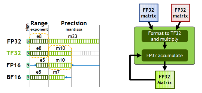 [特殊精度]TF32,Tensor Float 32,英伟达针对机器学习设计的一种特殊的数值类型,用于替代FP32。首次在A100 GPU中支持。由1个符号位,8位指数位(对齐FP32)和10位小数位(对齐FP16)组成,实际只有19位。在性能、范围和精度上实现了平衡。