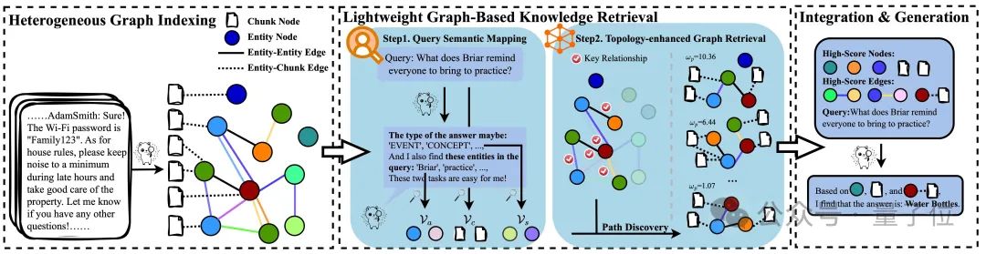 • 拓扑增强检索:检索过程分为两个环节,先基于语义特征快速定位核心信息点,再通过异质图结构化的关联分析扩展相关内容,实现准确和全面的信息获取。