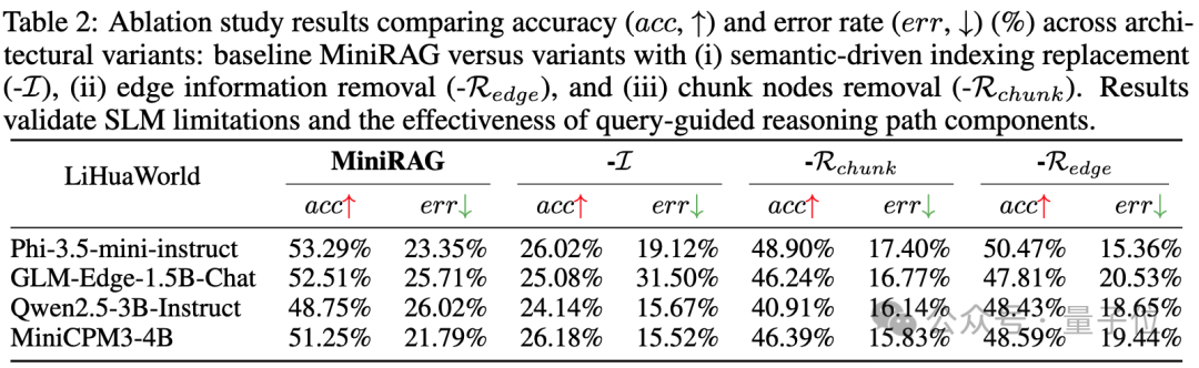 Reasoning Path Discovery的有效性。进一步的功能模块测试也带来了重要发现。实验表明,无论是剔除边际关联信息(-)还是移除块级节点(-),都会对系统效果造成显著影响。这些关键组件不仅通过智能路径推理提升了查询准确度,还有效克服了小型语言模型在知识处理上的固有不足。这双重优势凸显了MiniRAG架构设计的独特价值。